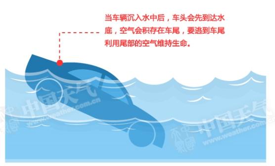 當水位已漫及車(chē)窗但未高過(guò)車(chē)窗時(shí),車(chē)門(mén)無(wú)法打開(kāi),從天窗或搖下側窗玻璃逃生。當車(chē)輛沉入水中后,車(chē)頭會(huì )先到達水底,空氣會(huì )積存在車(chē)尾,要逃到車(chē)尾,利用尾部的空氣維持生命。深吸一口氣,打開(kāi)車(chē)門(mén)或砸爛車(chē)窗逃出。