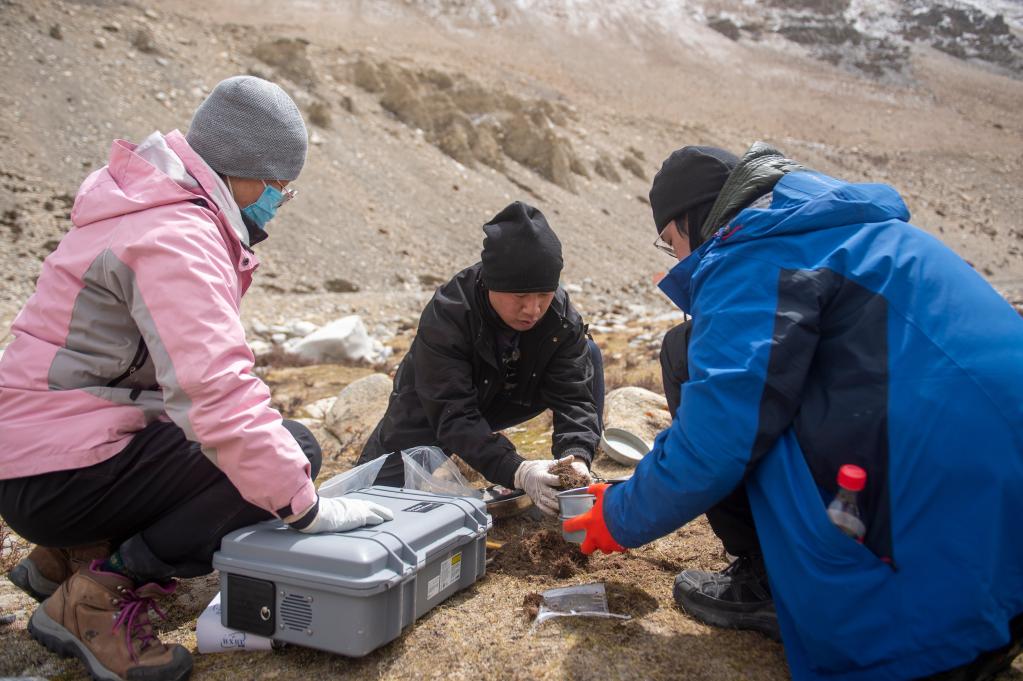 科研人員在珠峰地區采集土樣(4月30日攝)。新華社記者 旦增尼瑪曲珠 攝