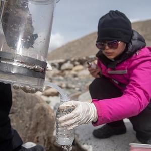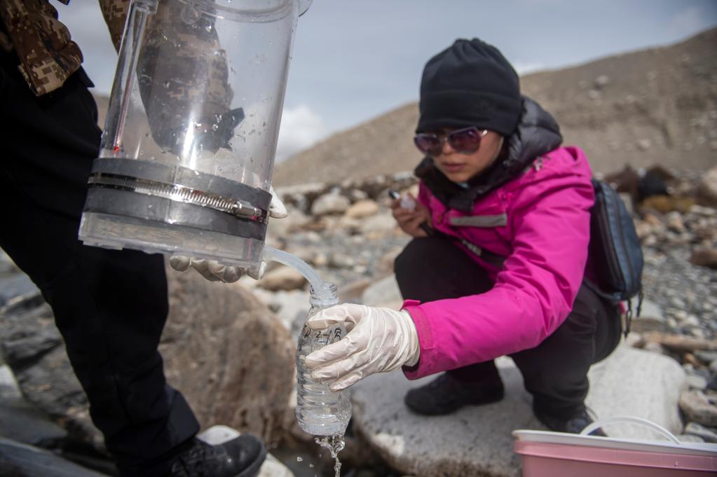 在東絨布冰川區域,科研人員正在進(jìn)行微生物指標水樣采集(4月30日攝)。新華社記者 旦增尼瑪曲珠 攝