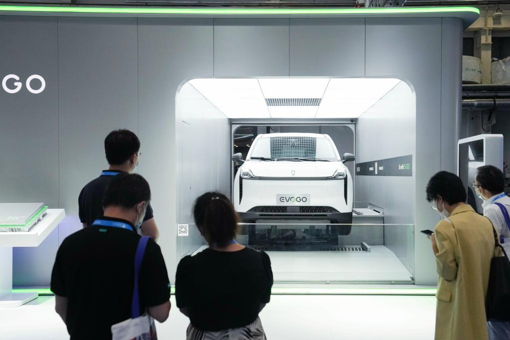 8月26日,2022世界新能源汽車(chē)大會(huì )上,參觀(guān)者在觀(guān)看一輛可換電池新能源汽車(chē)的換電演示。新華社記者 鞠煥宗 攝