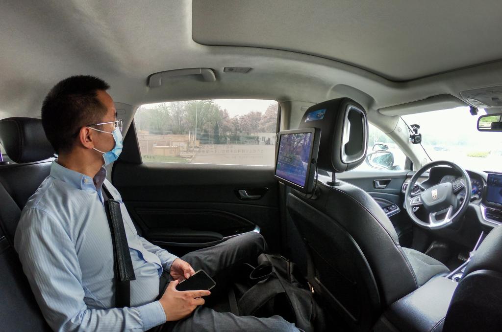 4月25日,在北京經(jīng)濟技術(shù)開(kāi)發(fā)區,一名乘客在體驗“主駕無(wú)人、副駕駛配備安全員”的無(wú)人駕駛車(chē)。新華社記者 彭子洋 攝