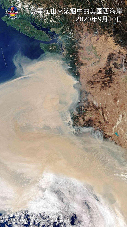 2020年9月10日,歐空局Sentinel-3衛星記錄下令人“窒息”的場(chǎng)景:山火產(chǎn)生的濃煙在加州、華盛頓州和俄勒岡州彌漫,并向西擴散到數千公里以外。