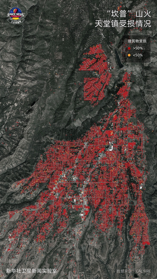 新華社衛星新聞實(shí)驗室分析顯示,天堂鎮幾乎完全處于WUI區域,其中大部分為建筑物與植被穿插的混合WUI,還有建筑物與茂密植被相鄰的交界WUI。