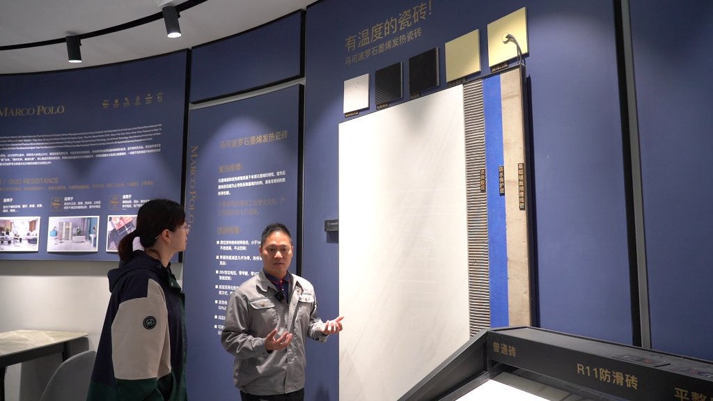 “這款發(fā)熱瓷磚屬于我們研發(fā)的功能瓷磚之一,我們給傳統瓷磚增加電路層和導熱性良好的石墨烯涂層,通電后瓷磚便可產(chǎn)生熱量供給人們使用。等到瓷磚溫度達到預設溫度后,便停止加熱進(jìn)入保溫狀態(tài)?!苯骱兔捞沾捎邢薰狙邪l(fā)副總監古戰文介紹。