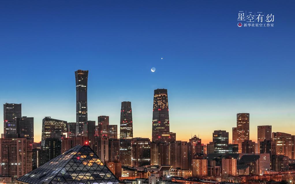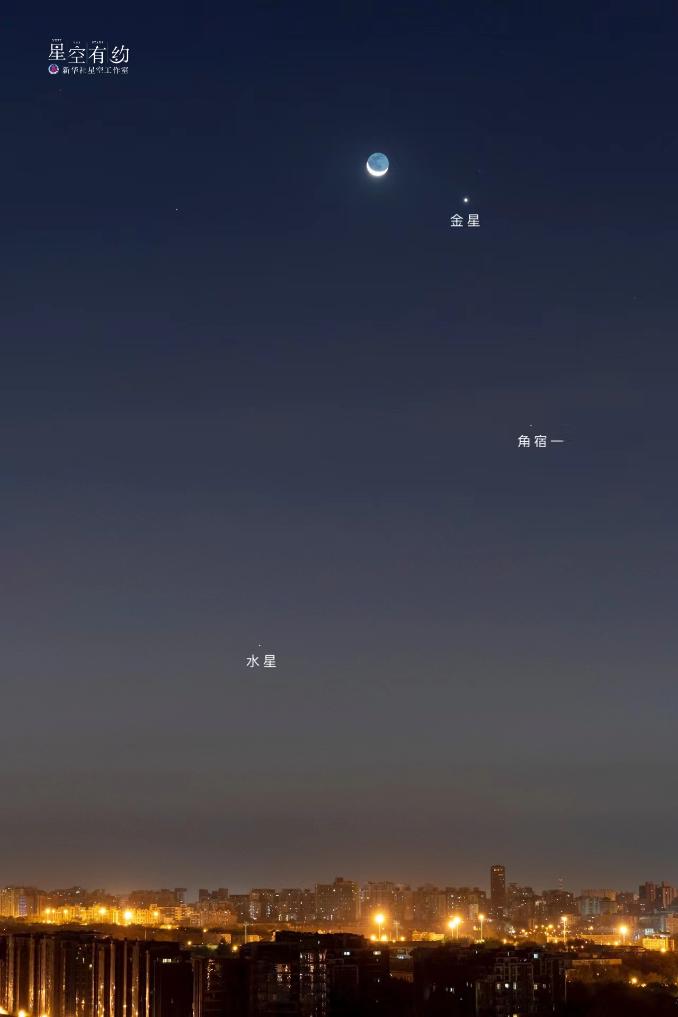 北京市天文攝影愛(ài)好者湯波2020年11月13日在北京拍攝的金星、角宿一、水星和彎月。(本人供圖)