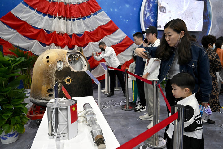 觀(guān)眾在安徽合肥舉辦的以“走向世界的中國航天”為主題的展覽上參觀(guān)嫦娥五號返回器等實(shí)物展品(2023年4月24日攝)。新華社記者 黃博涵 攝