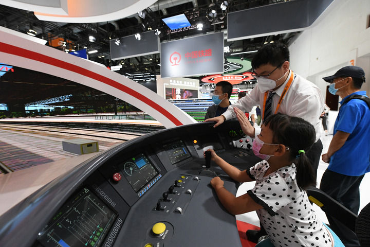 小朋友在2022年中國國際服務(wù)貿易交易會(huì )國家會(huì )議中心展館體驗京張高鐵動(dòng)車(chē)組模擬駕駛臺(2022年9月3日攝)。新華社記者 任超 攝