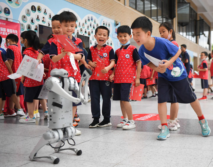 在湖南長(cháng)沙華夏實(shí)驗學(xué)校舉辦“科技大篷車(chē)”進(jìn)校園活動(dòng)上,學(xué)生們在和機器狗互動(dòng)(2022年6月22日攝)。新華社記者 薛宇舸 攝