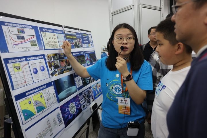在中科院物理研究所超導國家重點(diǎn)實(shí)驗室,志愿者在向參觀(guān)者普及超導知識(2023年5月13日攝)。新華社記者 金立旺 攝