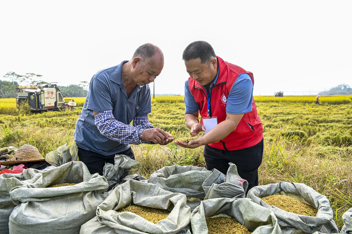 在廣西興業(yè)縣石南鎮鳳山村的稻田里,科技特派員(右)在查看晚稻品質(zhì)(2022年11月10日攝)。新華社記者 曹祎銘 攝
