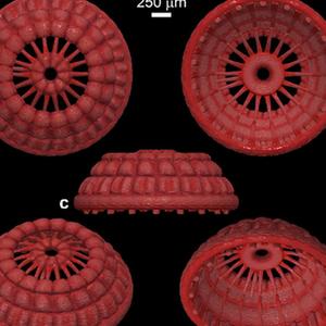 領(lǐng)導此項研究的中國科學(xué)院南京地質(zhì)古生物研究所研究員張華僑介紹,此次發(fā)現的動(dòng)物肌肉化石共有3枚,其中一枚較好保存了完整的肌肉結構。從形態(tài)上看,這種肌肉呈現類(lèi)似“五環(huán)”的結構,從頂到底由五個(gè)直徑逐漸增大的環(huán)組成。第一、二環(huán)基本處于同一平面,之間有明顯的空隙。第二到第五環(huán)緊密貼合,呈圓臺狀排列。第一、三環(huán)之間有19條輻射狀結構連接,第三、五環(huán)之間有36條縱向結構連接。肌肉化石標本體形微小,最大的五環(huán)直徑約3毫米。