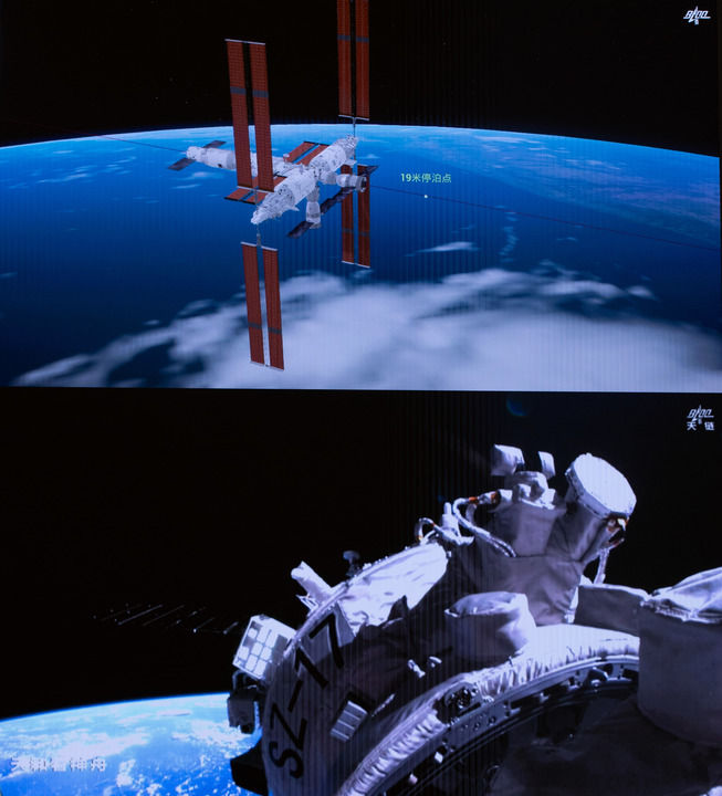 10月26日在北京航天飛行控制中心拍攝的神舟十七號載人飛船和空間站天和核心艙前向端口對接過(guò)程的畫(huà)面。新華社記者 金立旺 攝