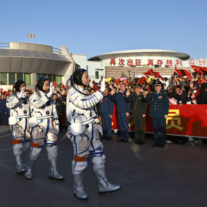 10月26日上午,身著(zhù)乳白色艙內航天服的3名航天員,在萬(wàn)眾矚目下,從酒泉衛星發(fā)射中心問(wèn)天閣出征太空。