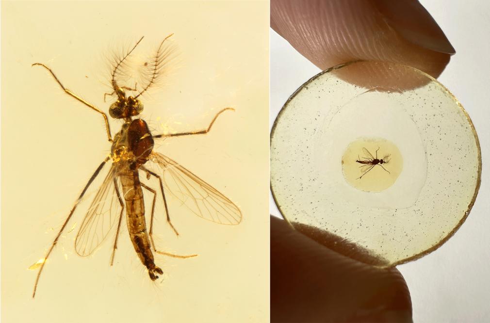 此次發(fā)現的雄蚊化石標本(左為琥珀中的遠古蚊子標本,右為琥珀薄片)。(中國科學(xué)院南京地質(zhì)古生物研究所供圖)