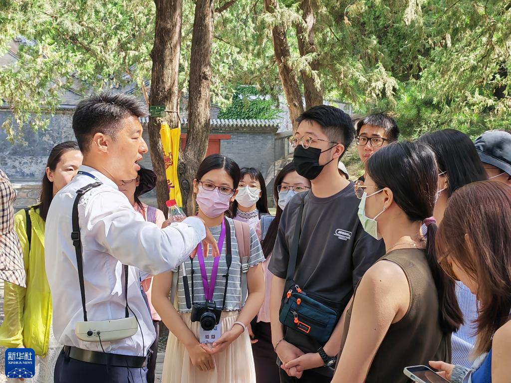參加臺胞青年夏令營(yíng)的青年在北京市頤和園內聆聽(tīng)講解員講解(7月7日攝)。 新華社記者 趙歡 攝