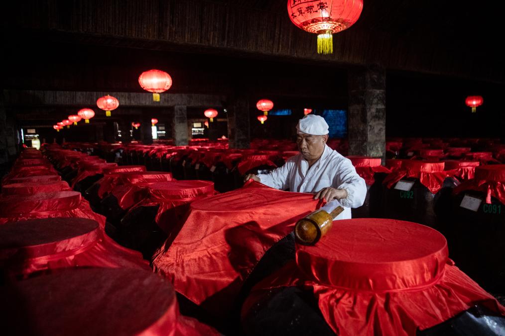 8月13日,李時(shí)珍醫藥集團有限公司釀造師徐平在酒窖忙碌。新華社記者 伍志尊 攝