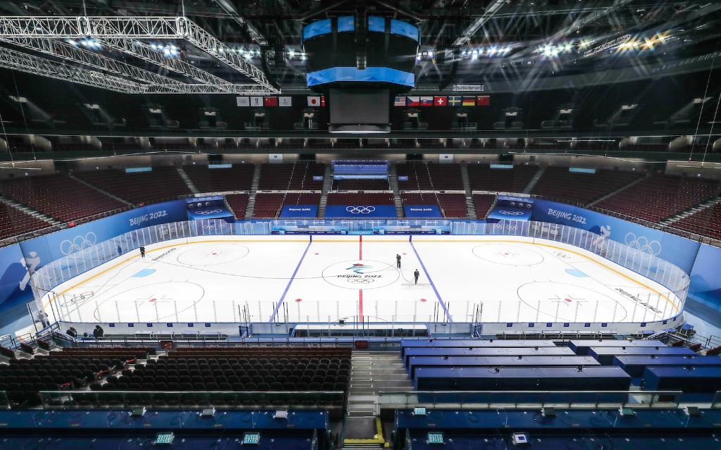14日,北京冬奧會(huì )冰球場(chǎng)館五棵松體育中心完成冰球標志、標線(xiàn)和冬奧會(huì )LOGO鋪設。此后,制冰工作進(jìn)入冰層加厚階段。