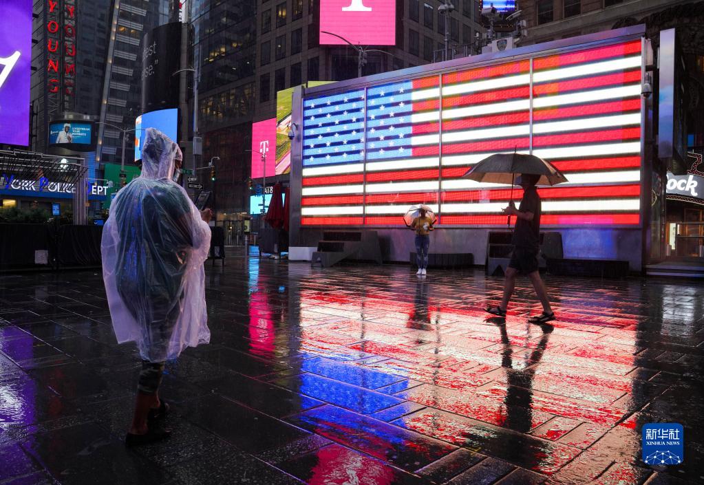 8月22日,人們行走在雨中的美國紐約時(shí)報廣場(chǎng)上。受熱帶風(fēng)暴“亨利”影響,美國紐約當日迎來(lái)降雨天氣。新華社記者 王迎 攝