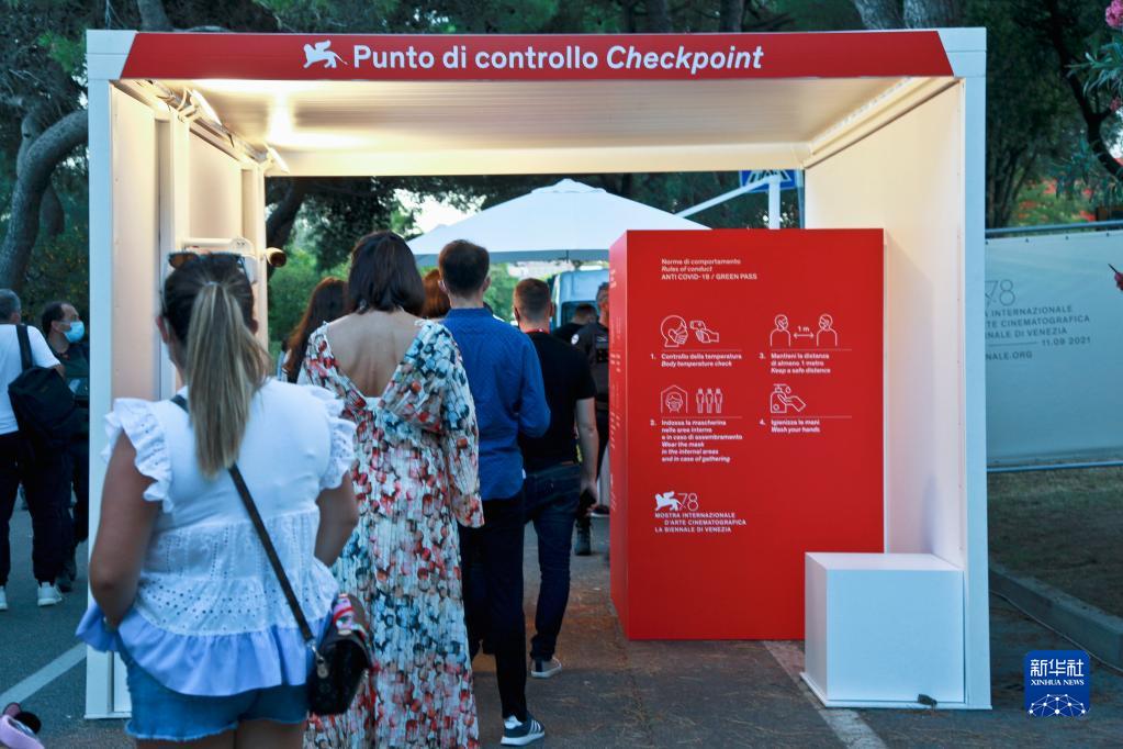 9月1日,在意大利威尼斯利多島,人們排隊進(jìn)入第78屆威尼斯國際電影節現場(chǎng)。