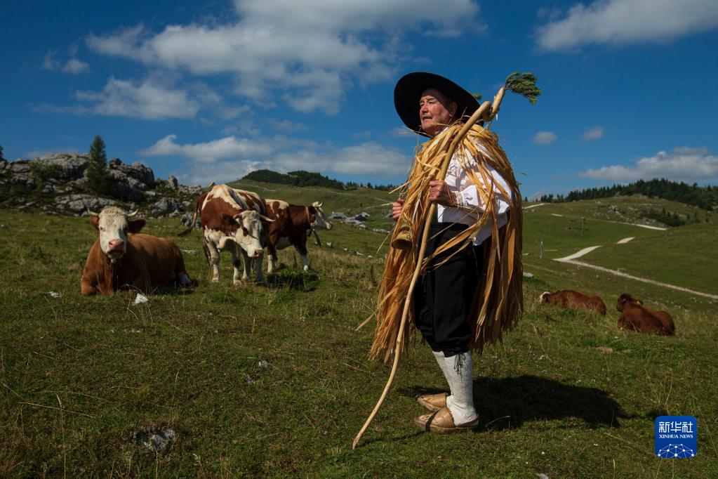 9月8日,斯洛文尼亞維利卡普拉尼那高地的老牧民彼得身著(zhù)傳統服飾在牧場(chǎng)上遠眺。