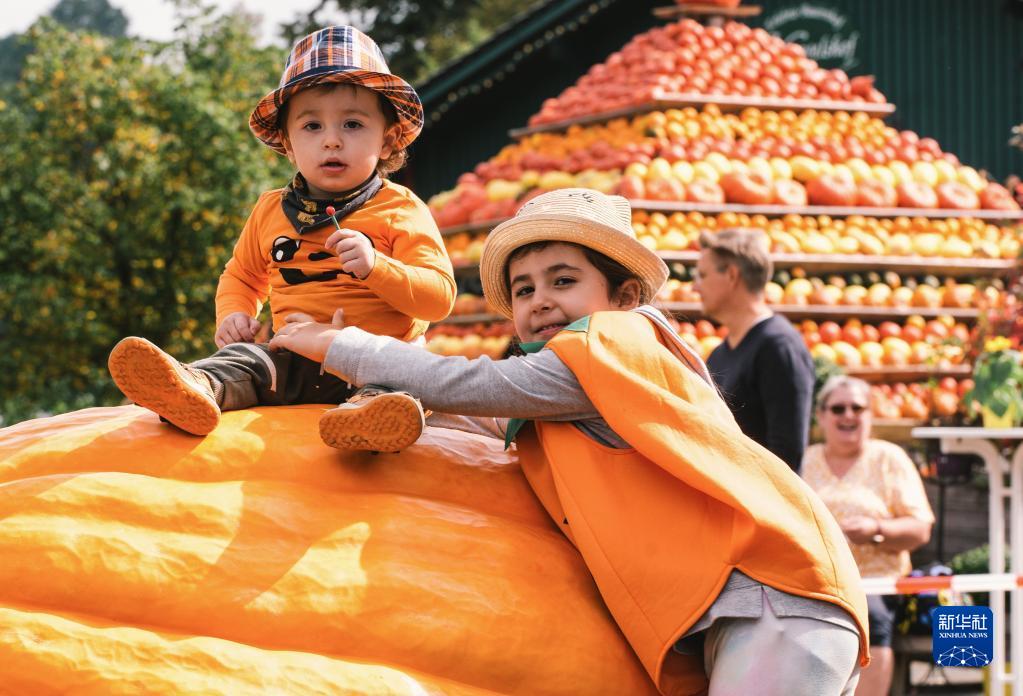 9月12日,在德國洛馬爾傳統南瓜節上,兒童在一個(gè)巨型南瓜上留影。