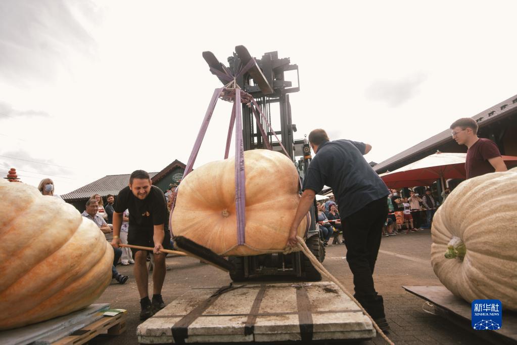 9月12日,在德國洛馬爾傳統南瓜節上,工作人員用鏟車(chē)給一個(gè)南瓜稱(chēng)重。