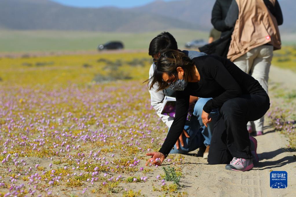 10月13日,在智利北部的阿塔卡馬沙漠,游人欣賞沙漠中開(kāi)花的美景。
