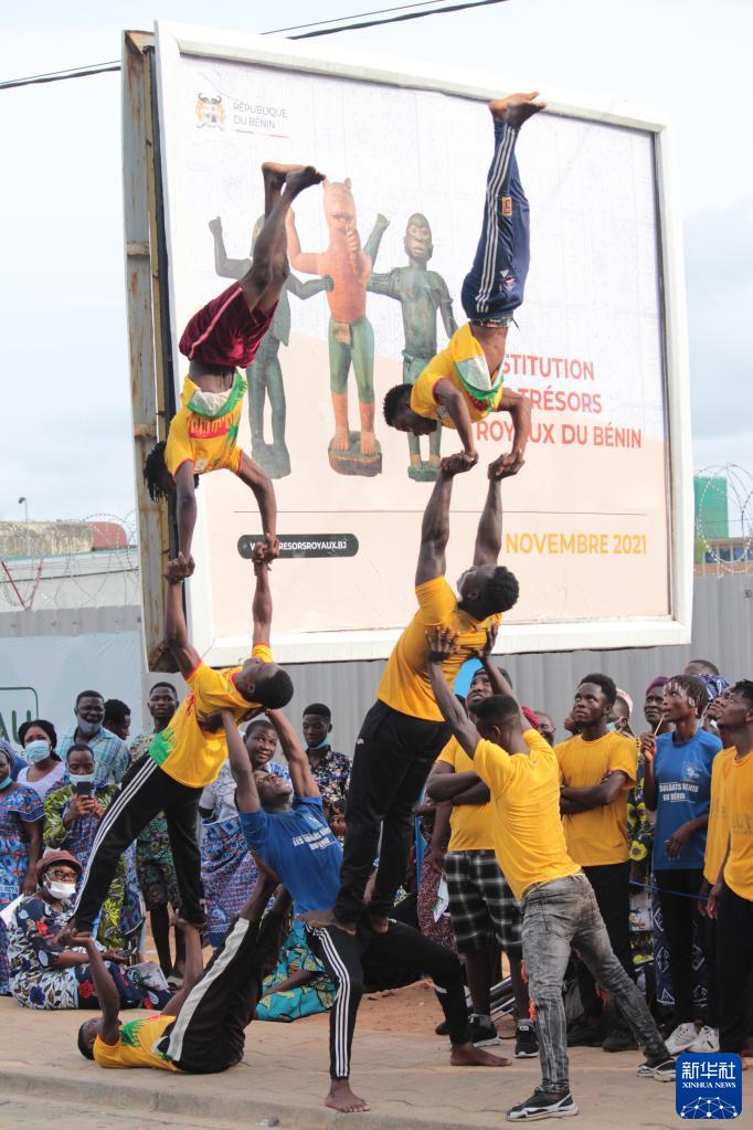 11月10日,人們在貝寧科托努機場(chǎng)附近表演雜技,慶祝文物回歸。