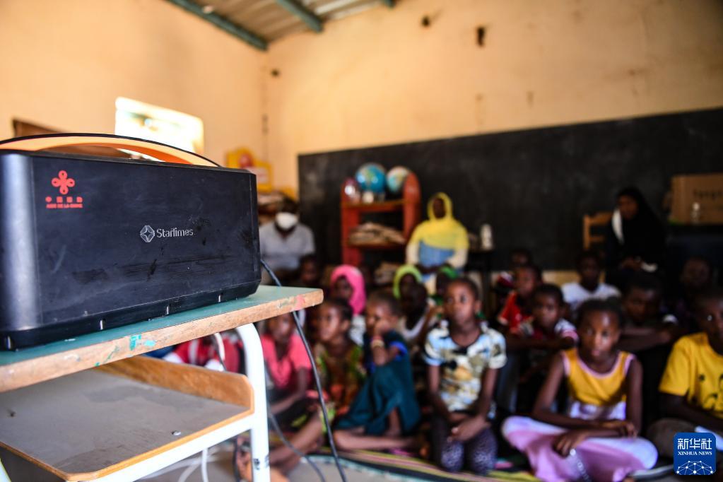 11月22日,在塞內加爾達喀爾近郊的辛迪亞小學(xué),同學(xué)們課間坐在教室的地毯上觀(guān)看投影播放的動(dòng)畫(huà)片。