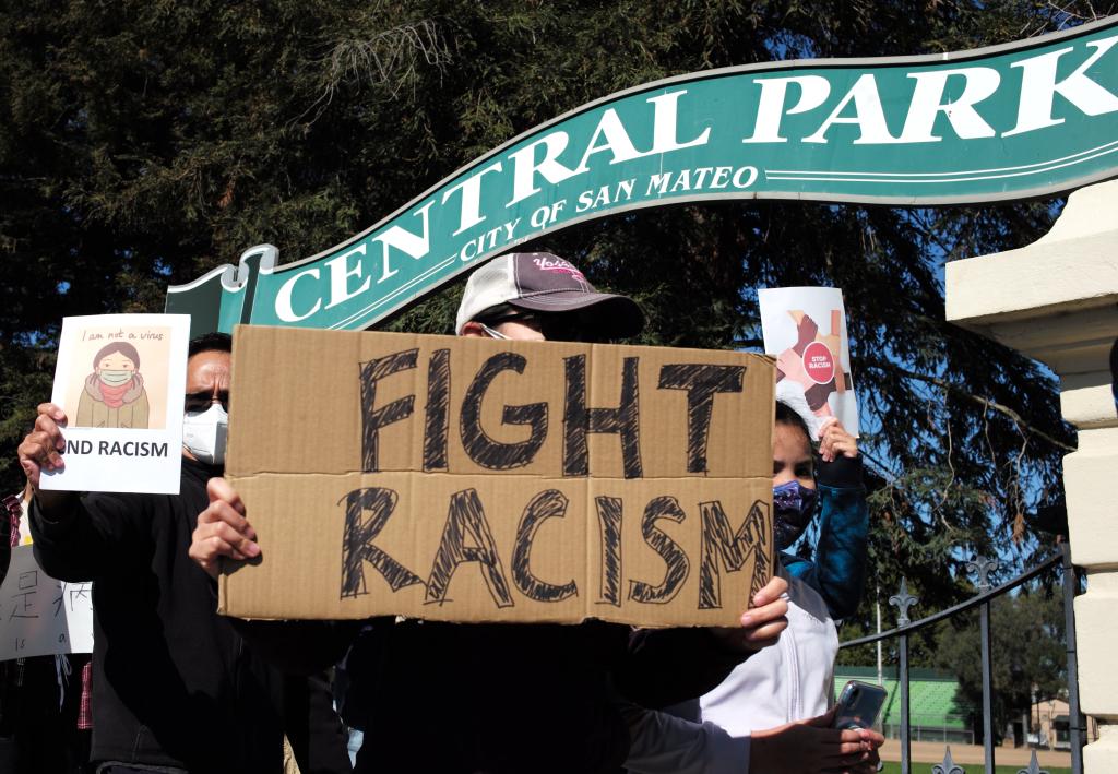 2月27日,在美國加利福尼亞州舊金山灣區圣馬特奧市,人們參加集會(huì )反對針對亞裔的歧視行為和仇恨犯罪。(新華社記者吳曉凌攝)