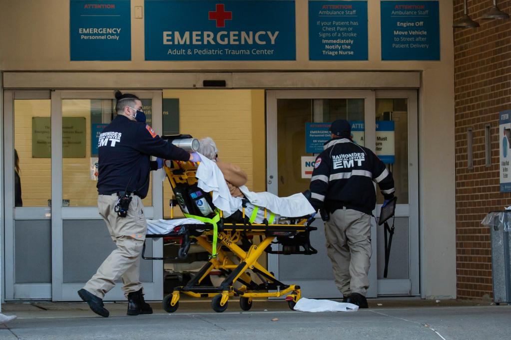 12月14日,在美國紐約,工作人員將一名病人送入醫院。美國約翰斯·霍普金斯大學(xué)12月28日發(fā)布的統計數據顯示,美國累計新冠確診病例逾5279萬(wàn)例,累計死亡病例逾81.8萬(wàn)例。(新華社發(fā),郭克攝)