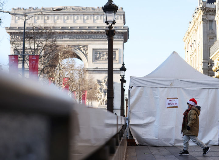 12月23日,一名兒童走過(guò)法國巴黎凱旋門(mén)附近的一處新冠病毒檢測點(diǎn)。新華社記者 高靜 攝