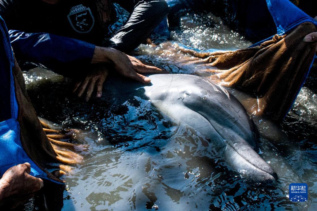2021年4月30日,在印度尼西亞南蘇拉威西省馬羅斯地區,工作人員營(yíng)救一只擱淺的海豚。