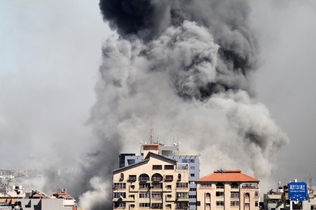 2021年5月15日,在加沙地帶,美聯(lián)社、半島電視臺等多家新聞媒體分支機構所在的大樓被以色列空襲后冒出濃煙。
