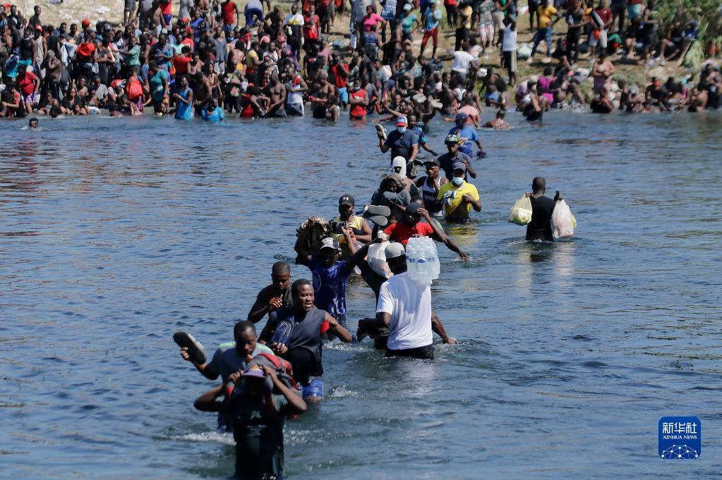 這張2021年9月19日從美墨邊境墨西哥科阿韋拉州阿庫尼亞城一側拍攝的照片顯示,購買(mǎi)物資的非法移民在里奧格蘭德河上往返。