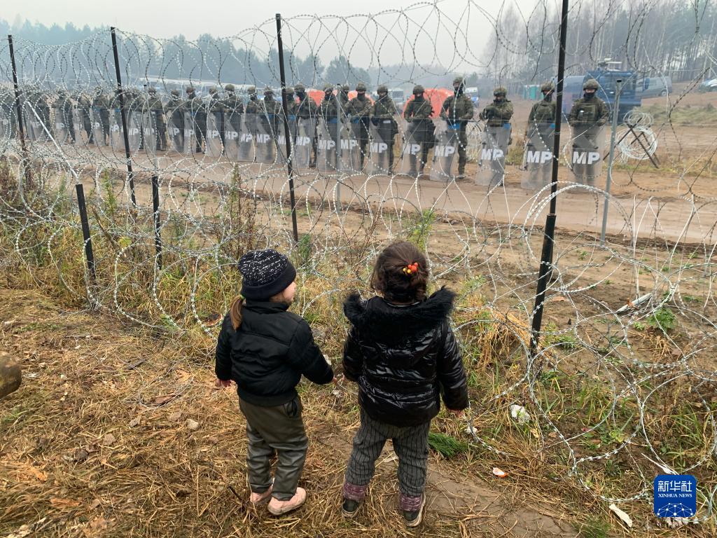 2021年11月14日,在白俄羅斯靠近波蘭邊境的一處難民點(diǎn),兩名兒童透過(guò)邊境線(xiàn)上的鐵絲網(wǎng)遙望波蘭一側的軍人。