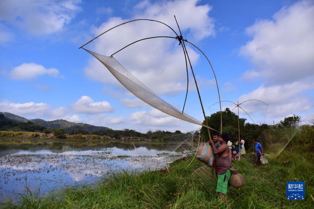 1月13日,在印度阿薩姆邦高哈蒂一處村莊,當地村民參加捕魚(yú)活動(dòng),慶祝收獲季的結束。新華社發(fā)