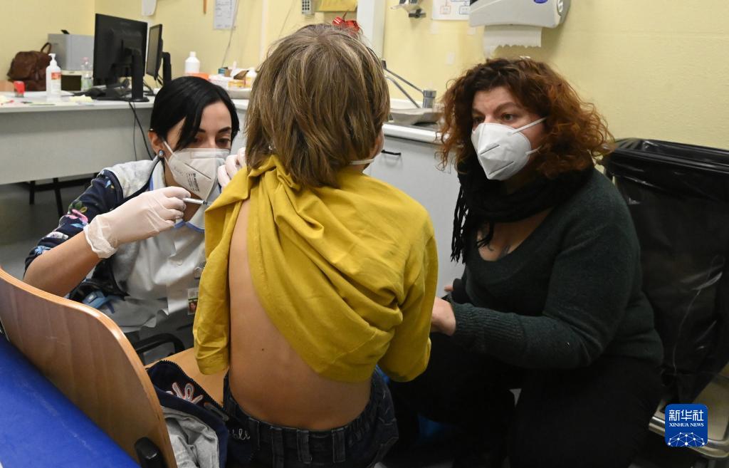 1月16日,一名兒童在意大利博洛尼亞一處新冠疫苗接種中心接種新冠疫苗。