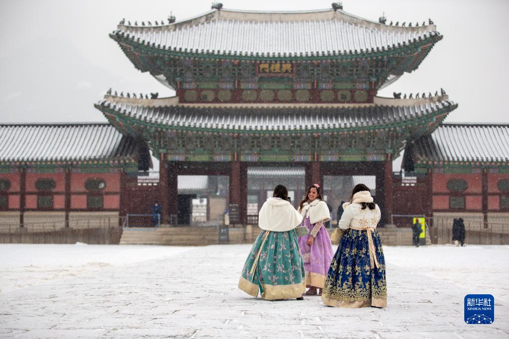 1月19日,在韓國首爾,游客在雪中游覽景福宮。