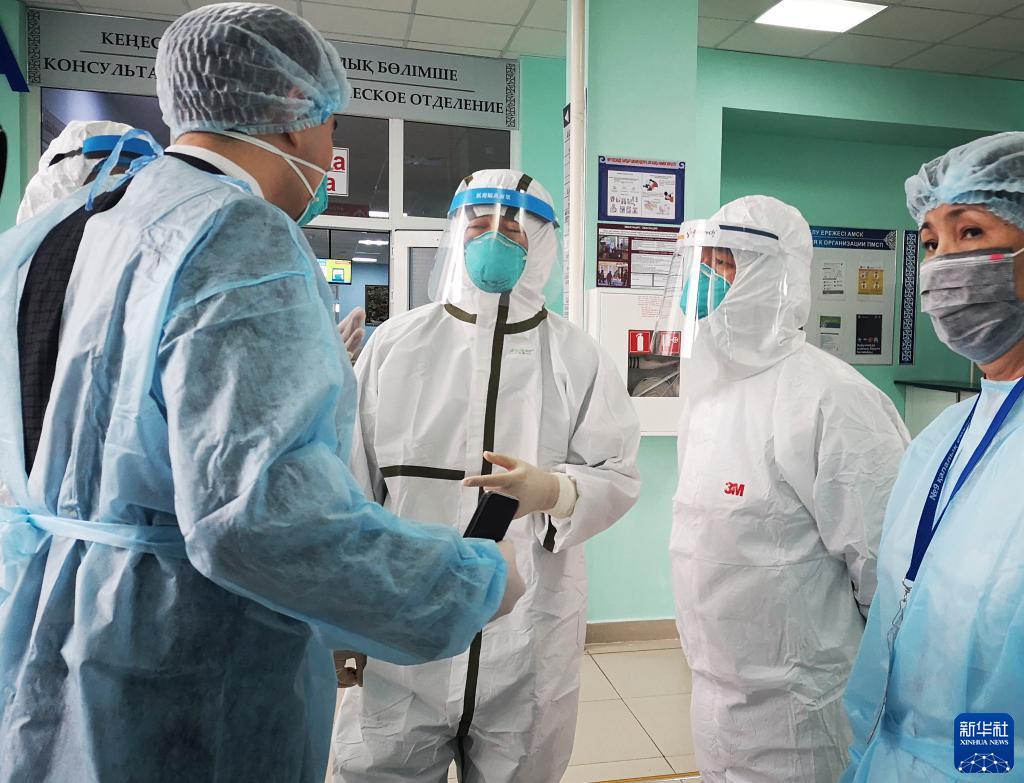 2020年4月14日,在哈薩克斯坦努爾蘇丹第九綜合醫院,中國援哈醫療隊成員與哈薩克斯坦醫護人員交流如何優(yōu)化醫院管理減少院內感染。新華社發(fā)(哈薩克斯坦實(shí)業(yè)報供圖)