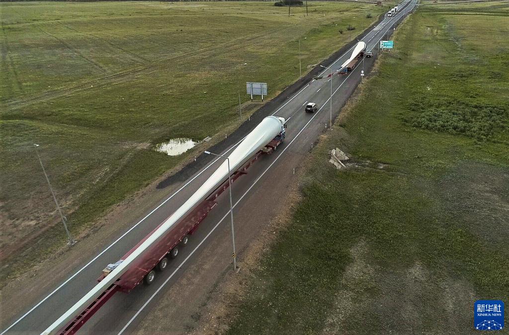 2020年6月23日,在哈薩克斯坦卡拉干達至努爾蘇丹段公路,卡車(chē)車(chē)隊運輸70米長(cháng)的風(fēng)機葉片(無(wú)人機拍攝)。新冠疫情期間,中國和哈薩克斯坦克服困難,繼續推動(dòng)新能源領(lǐng)域合作。中國生產(chǎn)的風(fēng)電設備跨越數千公里運輸至哈薩克斯坦,助力哈薩克斯坦可再生能源項目。新華社發(fā)(奧斯潘諾夫攝)