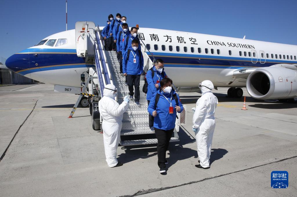 2020年4月20日,在吉爾吉斯斯坦首都比什凱克瑪納斯國際機場(chǎng),中國赴吉爾吉斯斯坦聯(lián)合工作組成員走下飛機。聯(lián)合工作組隨機攜帶了由新疆維吾爾自治區捐贈的一批抗疫醫療物資。新華社發(fā)(羅曼攝)