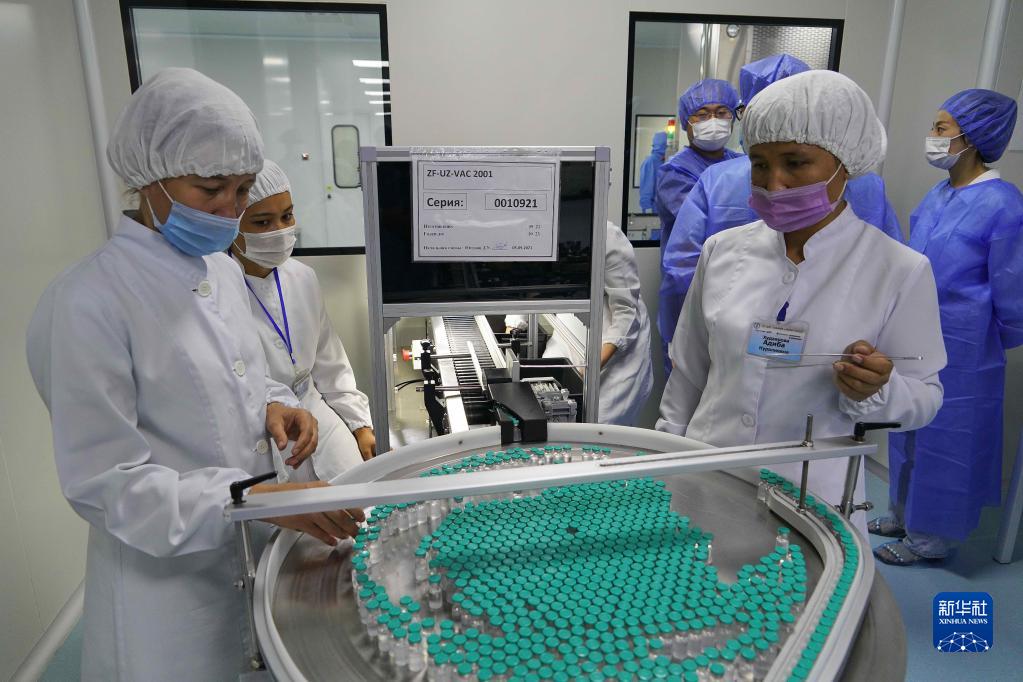2021年9月5日,在烏茲別克斯坦制藥企業(yè)祖拉貝克實(shí)驗室有限公司,工作人員在新冠重組蛋白疫苗生產(chǎn)線(xiàn)上工作。由中國科學(xué)院微生物研究所和安徽智飛龍科馬生物制藥有限公司共同研發(fā)的新冠重組蛋白疫苗在烏茲別克斯坦制藥企業(yè)祖拉貝克實(shí)驗室有限公司正式投產(chǎn),這是該國首次實(shí)現中國新冠疫苗本地化生產(chǎn),也是該款新冠重組蛋白疫苗的生產(chǎn)線(xiàn)首次在國外落地。新華社發(fā)(扎法爾攝)