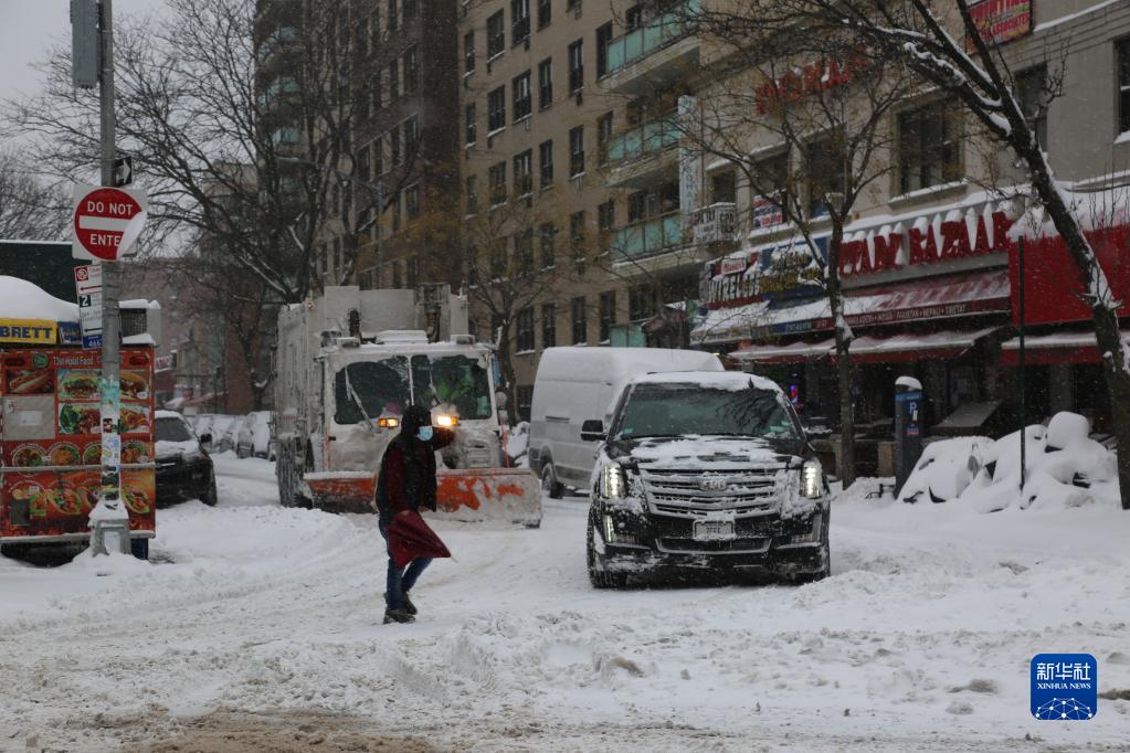 1月29日,在美國紐約,行人穿過(guò)積雪的街道。