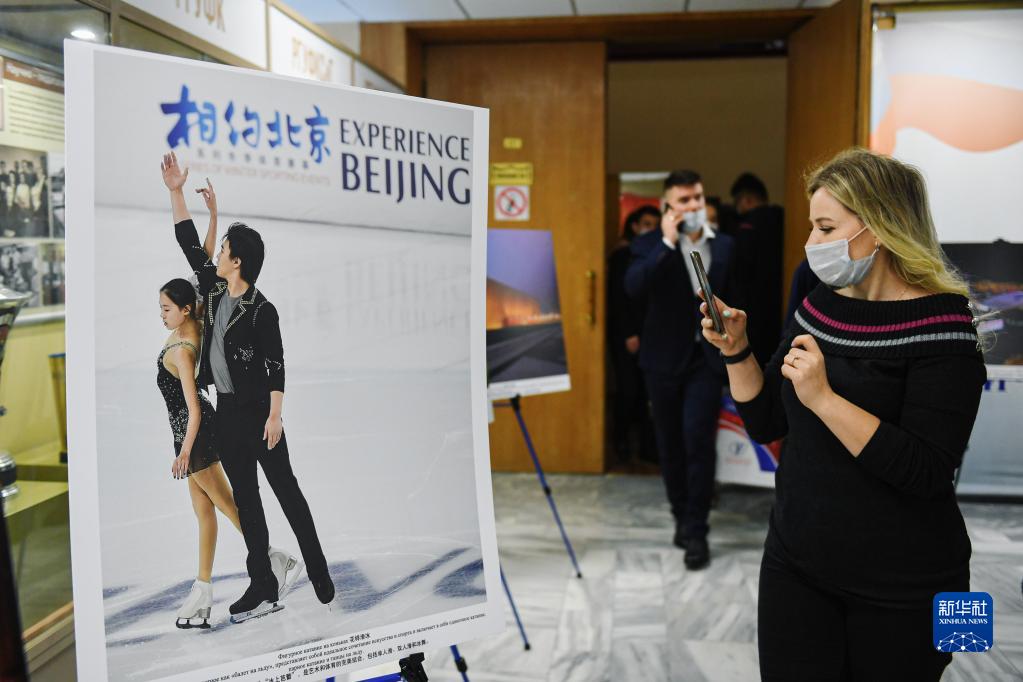 2022年1月21日,一名女子在俄羅斯莫斯科觀(guān)看“北京冬奧會(huì ),一起向未來(lái)”冬奧圖片展。新華社發(fā)(葉甫蓋尼·西尼岑攝)