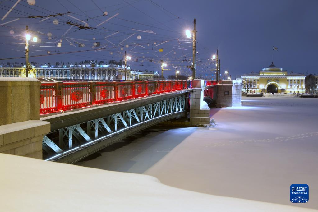 2022年1月31日傍晚,俄羅斯圣彼得堡地標性建筑冬宮橋亮起“中國紅”,迎接中國農歷虎年春節的到來(lái)。新華社發(fā)(莫京娜 攝)