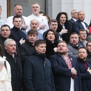 2月16日,在烏克蘭首都基輔,議員們在最高拉達(議會(huì ))門(mén)前的憲法廣場(chǎng)參加團結日慶?;顒?dòng)。