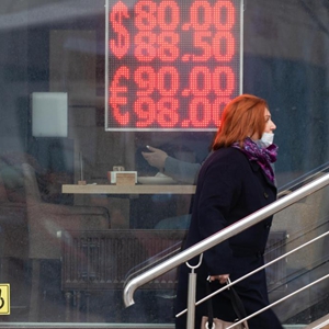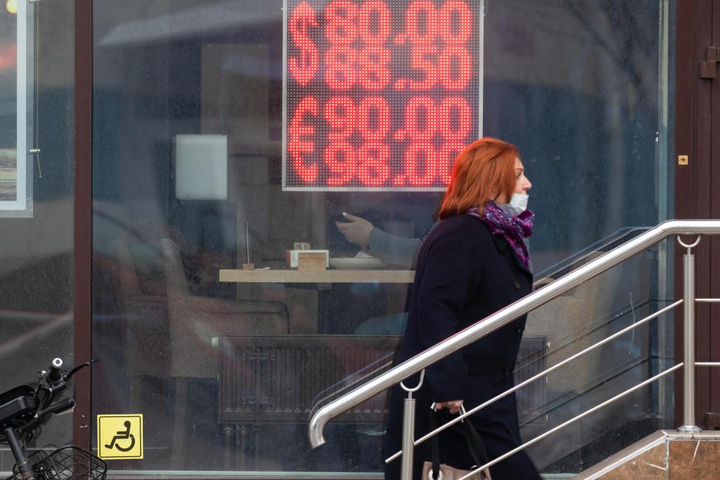 2月24日,在俄羅斯首都莫斯科,一名女子經(jīng)過(guò)一家外匯兌換點(diǎn)的匯率顯示屏。莫斯科證券交易所當日的數據顯示,在俄總統普京宣布決定在頓巴斯地區發(fā)起特別軍事行動(dòng)后,俄羅斯本幣盧布匯率暴跌。(新華社記者白雪騏攝)