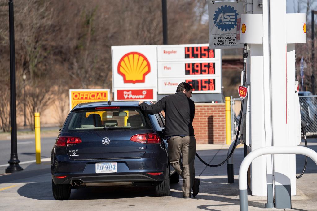 3月8日,一名男子在美國弗吉尼亞州阿靈頓一處加油站加油。新華社記者劉杰攝