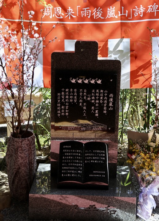 今年4月,嵐山再添總理詩(shī)碑。30多位中日民間有識之士日前從日本各地趕來(lái),聚集在與龜山公園僅一川之隔的大悲閣千光寺,共同見(jiàn)證《雨后嵐山》詩(shī)碑揭幕落成。